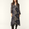 The Antal Dress from BA&SH is effortless, with a relaxed, feminine silhouette. This midi-length dress features a flattering V-neck with a delicate ruffle collar, 3/4 length sleeves with elasticated cuffs, and a beautiful abstract print in a rich Bleu Nuit hue. Made from semi-sheer viscose, it has a lined bodice and skirt for a smooth, comfortable fit.