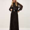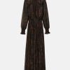 Bold and effortlessly elegant, the BA&SH Smoky Dress is a standout piece that blends wild charm with feminine sophistication. Designed in a flowing maxi length, this dress features a striking brown snake print in rich brown tones. The high neckline and long, sheer sleeves feel timeless and polished, while the smocked cuffs and cinched, smocked waist create a flattering, defined silhouette.