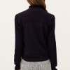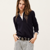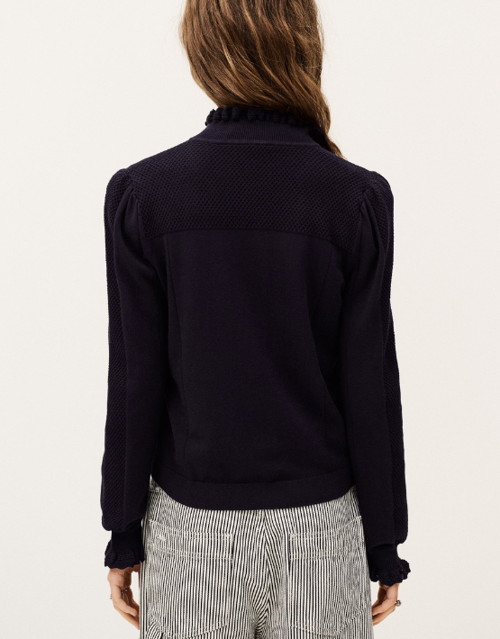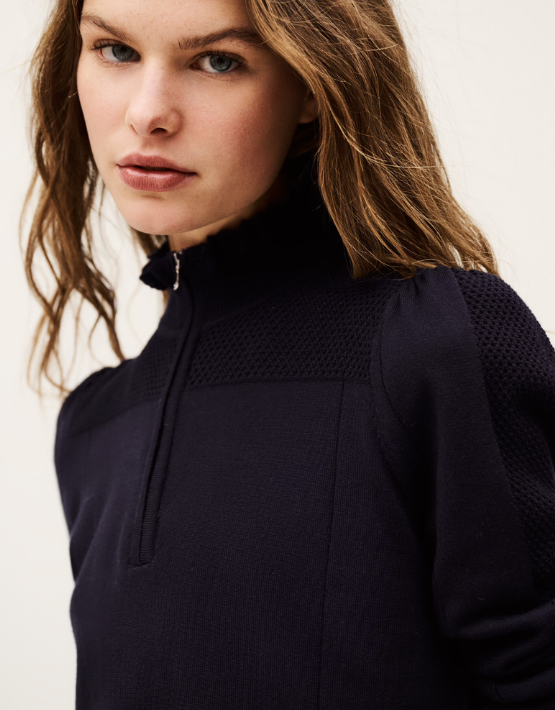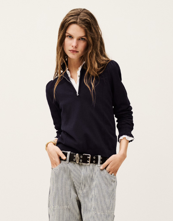 Introducing the BA&SH Suzanne Zip Neck Pullover in a rich marine blue – the perfect blend of style and comfort. Crafted from a luxurious mix of Modal and Organic Cotton, this pullover features intricate frill details on the collar and cuffs, adding a feminine touch to its clean design. Ideal for layering or wearing on its own, this piece effortlessly combines polished flair and casual ease.