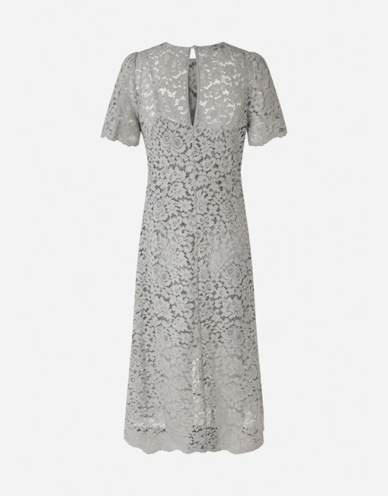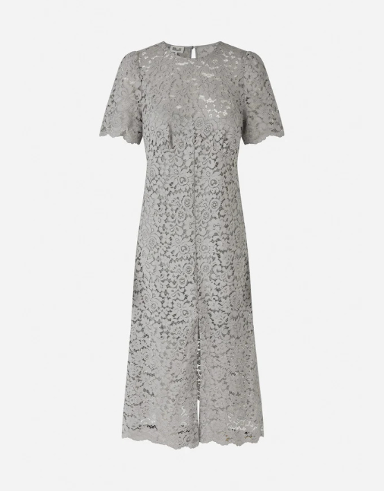 Elegance with a modern twist; the BAUM UND PFERDGARTEN Avigail lace dress in Griffin Grey is perfect for special occasions or elevated daytime looks. It features a front slit, scalloped hem and short sleeves.