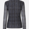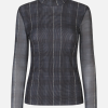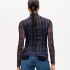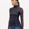 Back for another season in a new print; The Jodi top from BAUM UND PFERDGARTEN in Navy Check is a slim fit, stretchy mesh top with a high neck. The front panel is lined leaving the sleeves and back sheer.