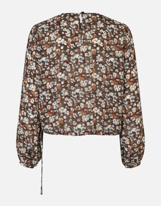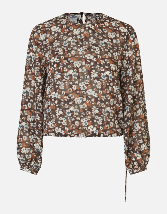 The BAUM UND PFERDGARTEN Milya Top features a delicate ditsy floral print in warm rust, cream, and blue tones. Designed with a round neckline, long sleeves, and a button-fastening keyhole at the back, it’s both feminine and easy to wear. An adjustable drawstring hem lets you play with volume, wear it loose for a relaxed fit or cinch it in for added shape.