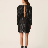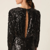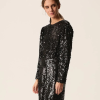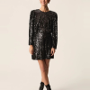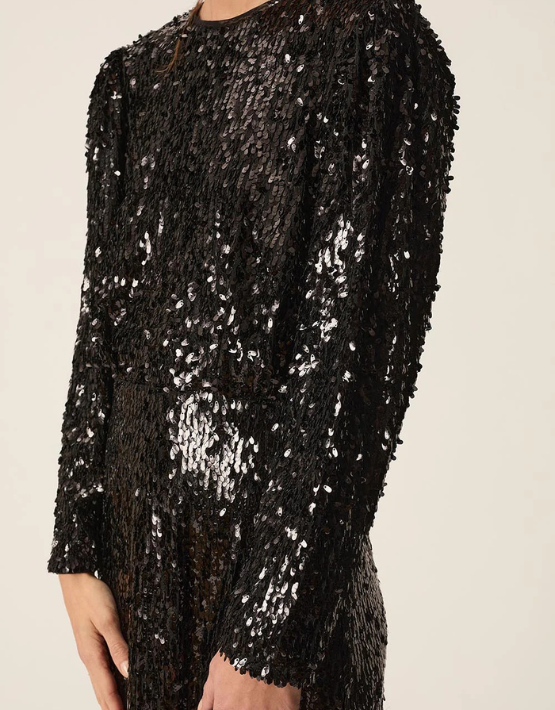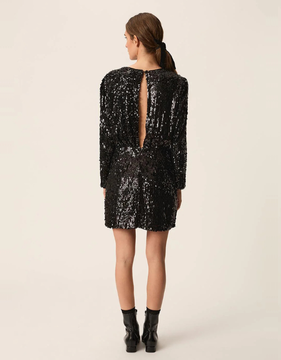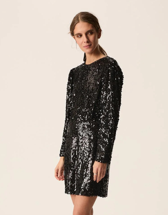 Shimmer with confidence in the DES PETITS HAUTS Isaure dress. A figure-hugging, waist-fitted silhouette crafted from dazzling black sequins. Structured shoulders and lightly gathered long sleeves create a refined look, while the round neckline and back opening adding elegant finishing touches. Fully lined in soft jersey, it delivers both comfort and glamour; perfect for every festive occasion. Bold, modern, and irresistibly glamorous, the Isaure sequin dress is your go-to for parties, celebrations, and every moment that calls for a touch of sparkle.