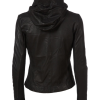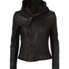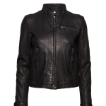 The Stine Hood jacket from Munderingskompagniet/MDK is a slim fit leather jacket with a concealed asymmetric zipper and leather hood. The side panels on the sleeves are knitted, which gives the jacket a fitted look.