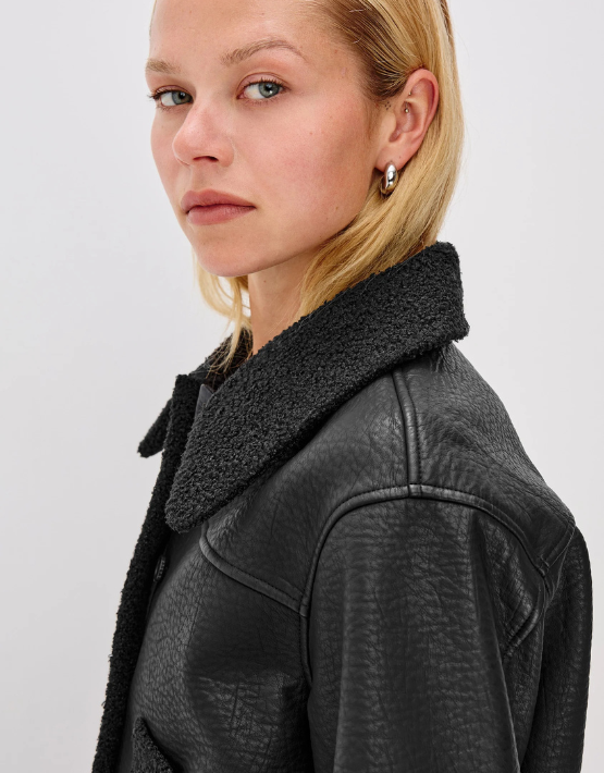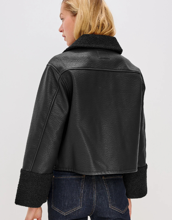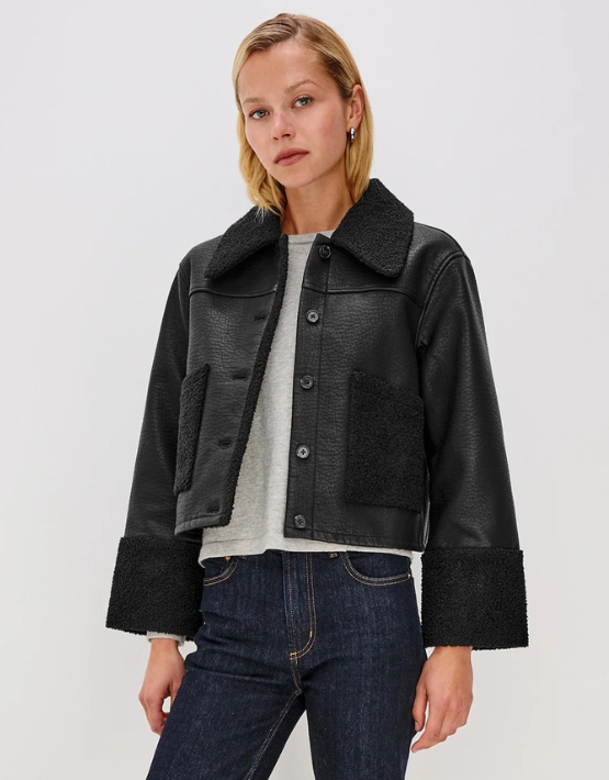 A nod to ’60s style with modern ease. The RAILS Dria Jacket in black features a cropped, boxy silhouette that’s effortlessly flattering. Luxe faux shearling trims the cuffs, collar, and patch pockets for a touch of texture, while faux-horn logo buttons complete the look. Timeless and versatile, this is the statement layer your wardrobe’s been waiting for.