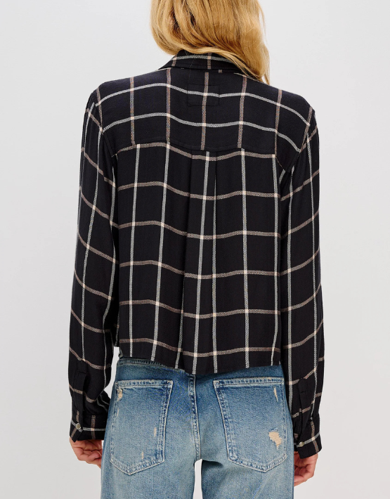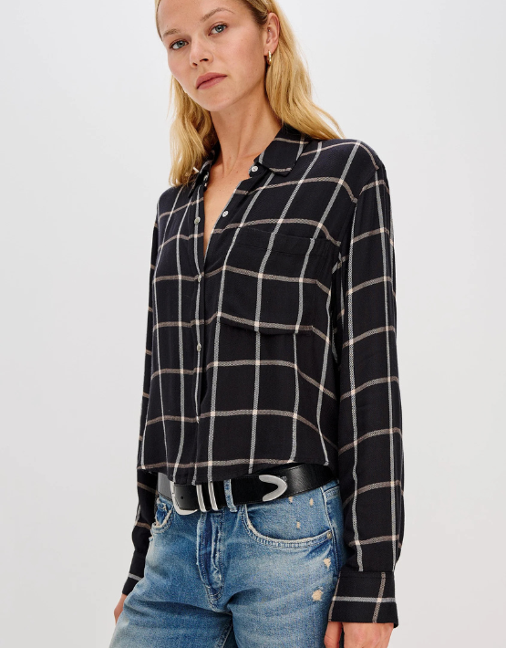 A modern twist on a RAILS classic. The Malin Shirt offers a cropped take on the iconic Hunter silhouette; cut 5 inches shorter for a fresh, flattering fit. Crafted from super-soft rayon in an Onyx Sand Birch check, it features a classic collar, button front, long sleeves with button cuffs, and a curved hem.
