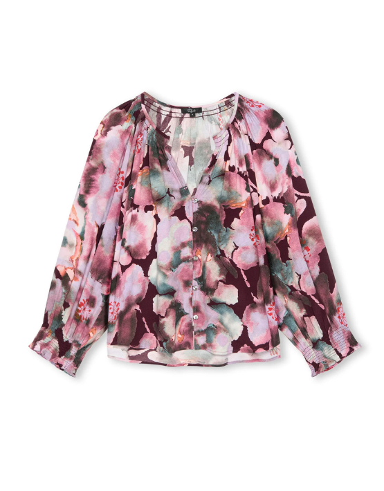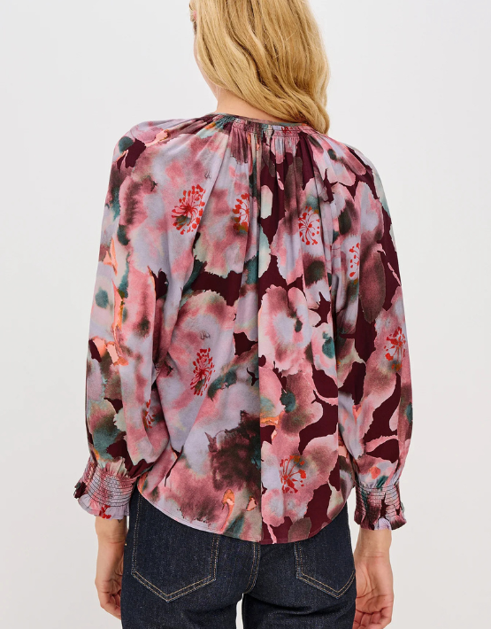 A romantic take on everyday dressing; The RAILSMariah Top features a soft magenta verbena floral print and feminine detailing throughout. Designed with an open V-neckline, 3/4 length raglan sleeves with shirred cuffs, and delicate gathering from the collar, it elevates everyday outfits with soft, feminine style.