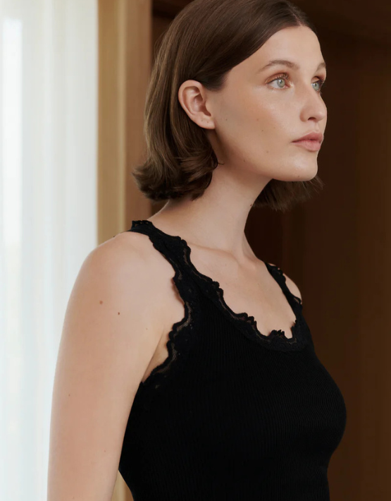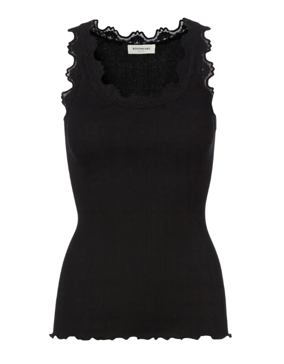 A wardrobe staple; The Babette U-neck vest from ROSEMUNDE in black is made from a soft, seamless ribbed silk jersey. It features lace trim along the rounded neckline and a curl-edge on the bottom. Style alone, or layer under everything from fine knits to oversized shirts.