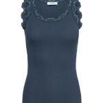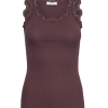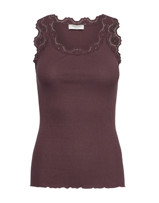 A wardrobe staple; The Babette U-neck vest from ROSEMUNDE in Fudge is made from a soft, seamless ribbed silk jersey. It features lace trim along the rounded neckline and a curl-edge on the bottom. Style alone, or layer under everything from fine knits to oversized shirts.