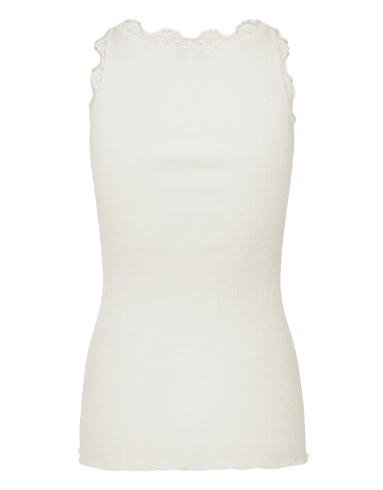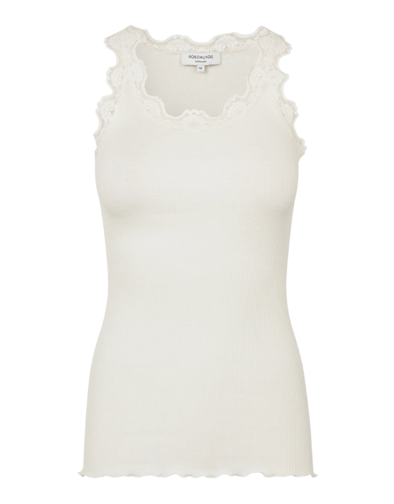 A wardrobe staple; The Babette U-neck vest from ROSEMUNDE in Ivory is made from a soft, seamless ribbed silk jersey. It features lace trim along the rounded neckline and a curl-edge on the bottom. Style alone, or layer under everything from fine knits to oversized shirts.