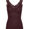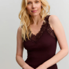 A wardrobe staple; The Bernadine V-neck vest from ROSEMUNDE in Fudge is made from soft, organic cotton in a seamless ribbed jersey. It features lace trim along the V-neckline and a curl-edge on the bottom. Style alone, or layer under everything from fine knits to oversized shirts.