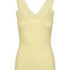 A wardrobe staple; The Bernadine V-neck vest from ROSEMUNDE in Pastel Yellow is made from soft, organic cotton in a seamless ribbed jersey. It features lace trim along the V-neckline and a curl-edge on the bottom. Style alone, or layer under everything from fine knits to oversized shirts.