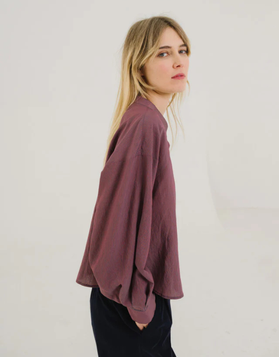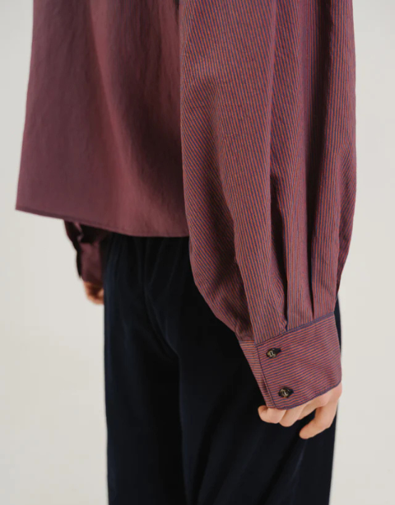A modern twist on a classic silhouette; The SACRECOEUR Alice Byron Shirt is cropped and collarless, featuring a clean mandarin collar and concealed button front for a sleek, minimalist look. Crafted in a fine navy and red stripe design, it’s finished with long raglan sleeves and buttoned cuffs for a relaxed yet polished feel.