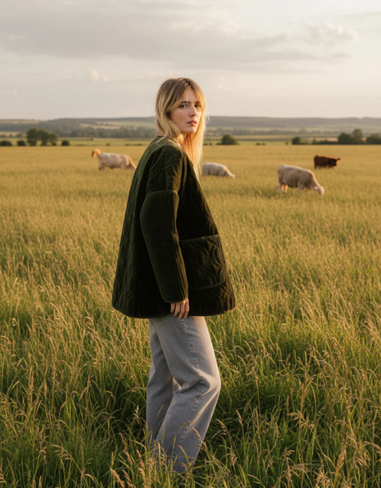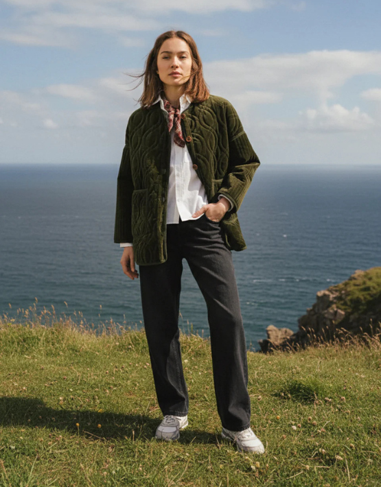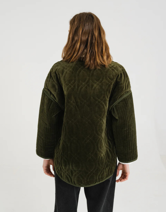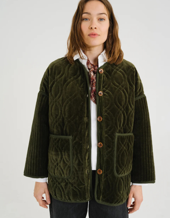 The SACRECOEUR Bari Jacket is crafted from quilted cotton velvet in a rich khaki green, offering warmth with a touch of texture. Its oversized, collarless design features dropped shoulders, a mid-length cut, and two front patch pockets for a relaxed, modern look. Finished with a clean button front, it’s an easy layer for transitional weather.