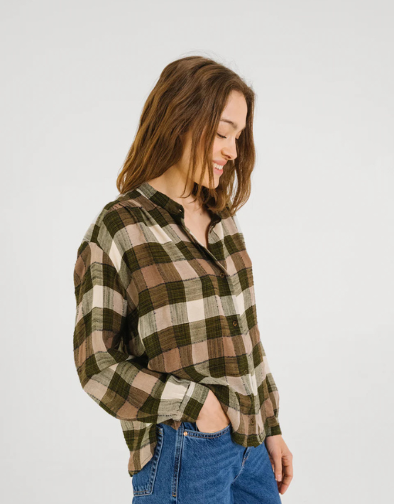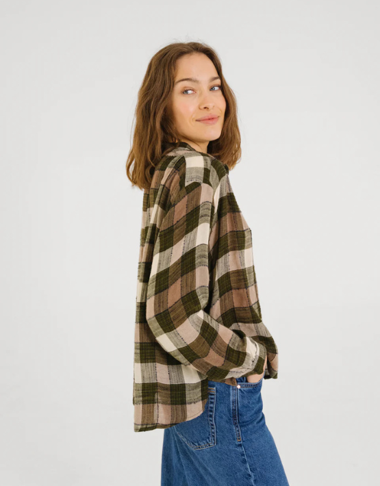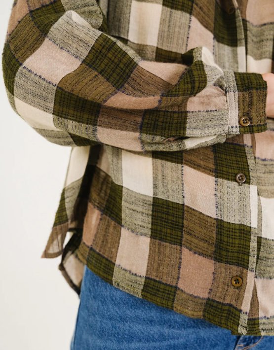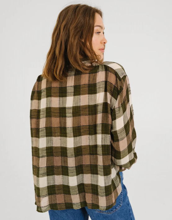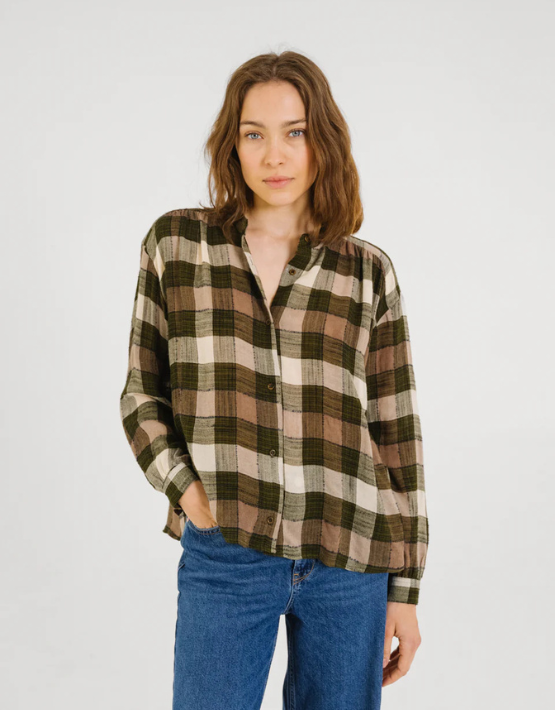The Ella shirt from SACRECOEUR comes in a lovely khaki, ecru, and taupe checks design. Made from a cotton and viscose blend, it is cut for a relaxed fit and features a mandarin collar, button front and gathered details across the shoulders.