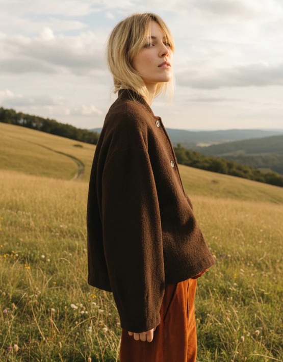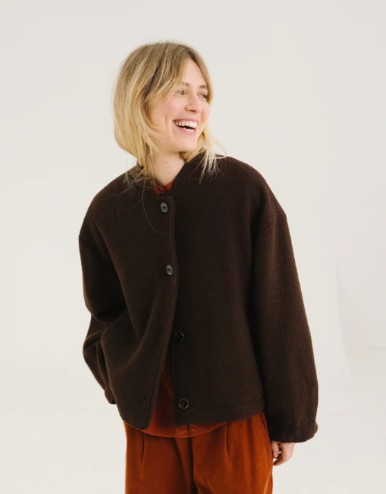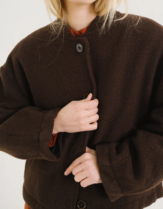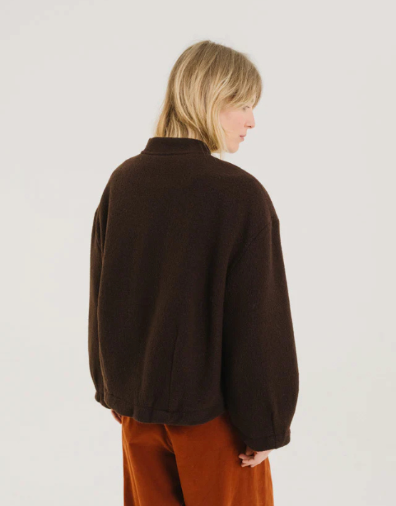 A modern take on the bomber, reimagined in rich boiled wool. The SACRECOEUR Jay Brownie Jacket comes in a deep chocolate marron and features a structured silhouette with wide pleated sleeves for added volume and comfort. Fully lined and finished with a round bomber-style collar, exposed buttons, and discreet in-seam pockets, it blends warmth with understated elegance.