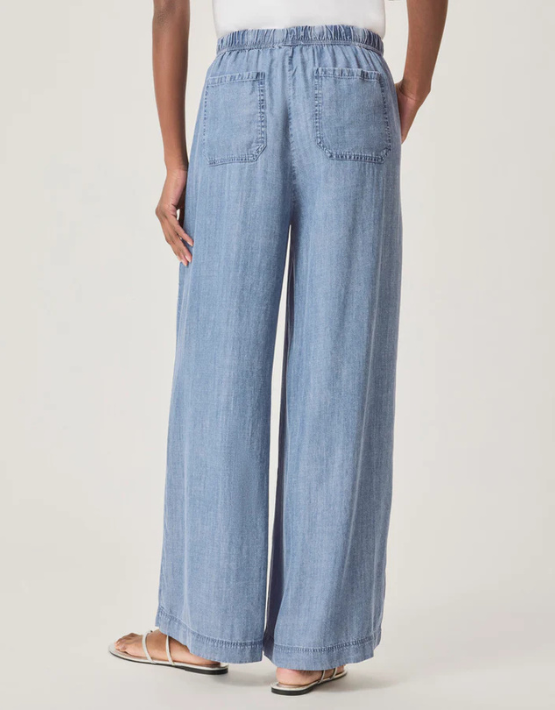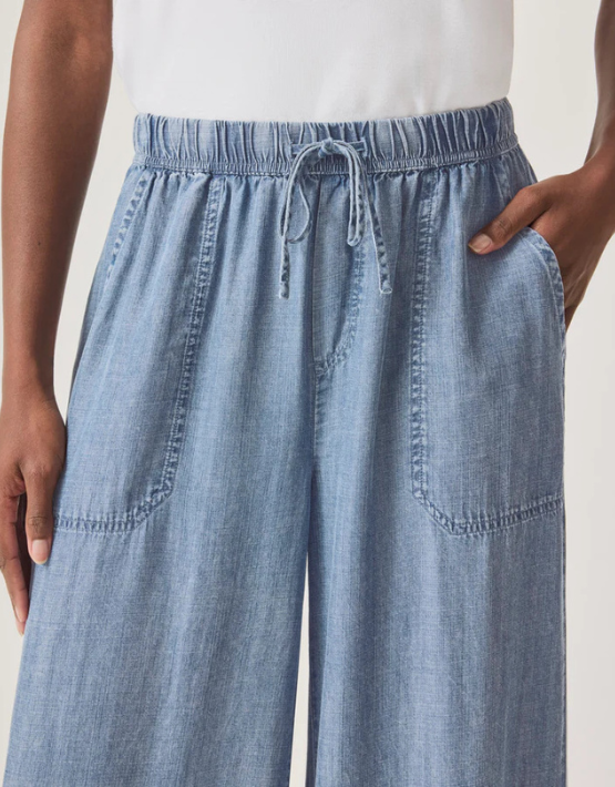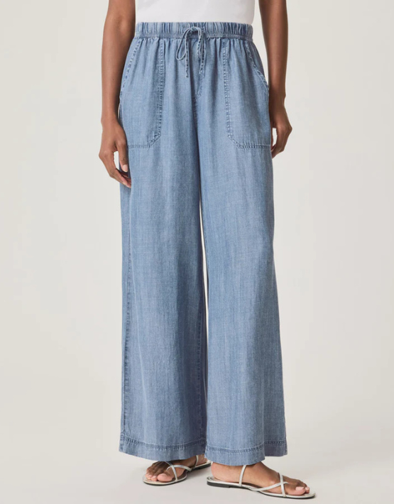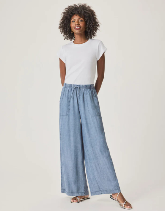 The Angie trousers from SPLENDID feature a light indigo wash and are crafted from a soft and lightweight chambray Lyocell. Designed with a wide-leg fit and an elasticated drawstring waist, they offer a relaxed, effortless silhouette—ideal for sunny weekend getaways.