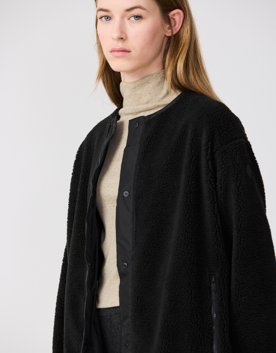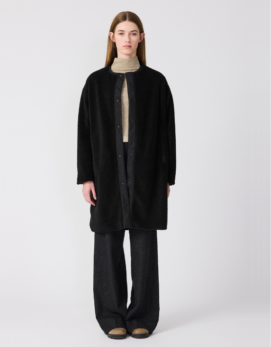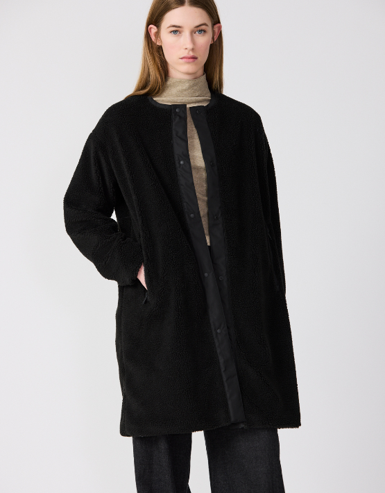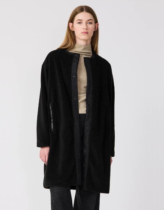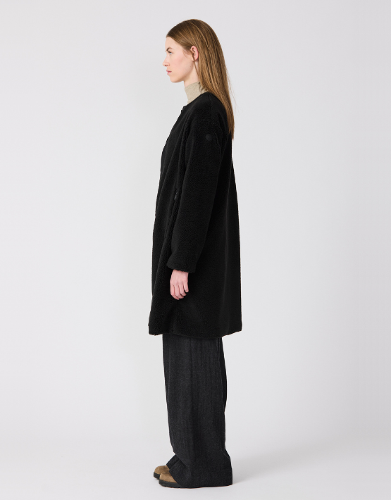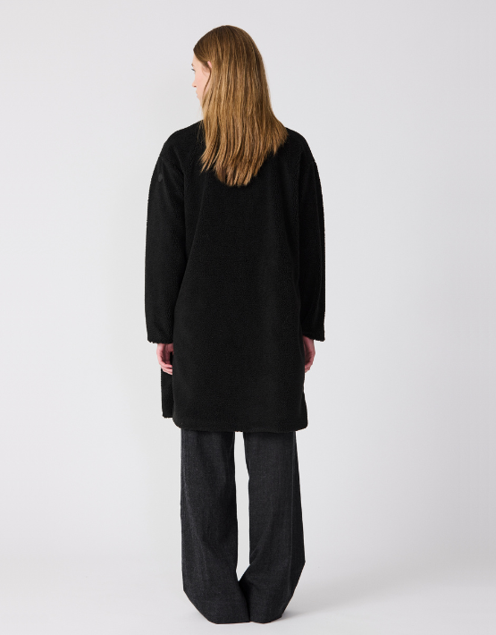 The Drivotra Sherpa Coat by TANTA is made from soft, longline fleece in classic black. It offers a relaxed fit that layers effortlessly through colder months.